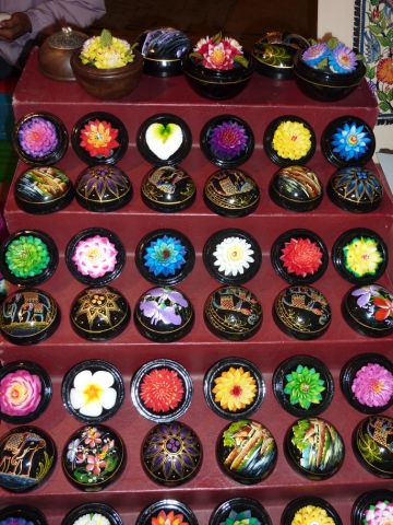 それ程大した物がないのがチェンマイのナイトマーケット。 地図で見ると城壁外で右側、ピンリバーよりのチェンカン通り辺りに広がります。 かなり広範囲です。 民族物、特徴のある物が少なく質もいまいち。 フードコートも新鮮さにかけ、タイ料理以外でつまらなかったです。ステージがあり無料のショーはありました。 ムエタイのスタジオも近くにあり、デビィジョンが低いので安く見られるそうです。 フードコート辺りのマッサージは他よりは安く30分の足マッサージが80バーツでした。 私の中ではここのマーケットランキングは下ですが、ただ、時にはいい物もあります。 石鹸に花の彫刻をして売るお店が多いのですが、フードコートのある建物内にあるこの叔父さんが作る花はすごく上手でした。 可愛いボックスにも入れてくれます。 交渉して、小さいのは一つ65バーツ。