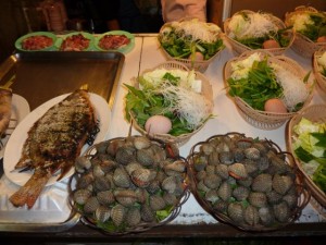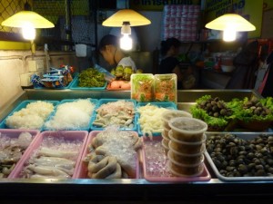 次にチェンライのナイトマーケットも民族物のスカーフやカバンが揃ってます。 チェンライはバスステーション辺りにお店が広がります。 チェンマイやラオスに似た感じの物もありますが、比較的小さめでお店の人もプッシーでないのでゆっくり選べるかと思います。 ここのナイトマーケットのもう一つのいい所はフードコートです。 海ではないですが、新鮮そうな魚介類が豊富。 鍋やバーベキューが多いです。 大きなステージもあり、安くショーと食事が楽しめます。