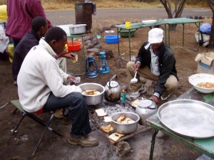 アフリカオーバーランドやベーシックサファリのキャンプツアーの食事は、共同で皆で作る場合とGアドベンチャーのツアーのようにコックさんがついていて片付け程度を手伝うだけのツアーがあります。