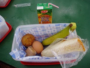 移動日のランチはランチボックスになります。 これはベジタリアン(ジャムサンドや卵サンド)ですが、お肉が食べれる人はハムサンドやから揚げが入っていたりします。