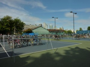 テニスコートを自転車置き場に。 下のはオリンピックビレッジの自転車置き場。 自転車利用を呼びかけ、ボランティアの人達が札を渡し、無料で保管してくれてました。