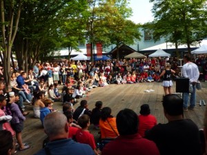 グランビルアイランドは陸続きの小さな島です。 催し物が入り江の逆からも見えます。 皆赤い服を着ているので一面赤くなってました。