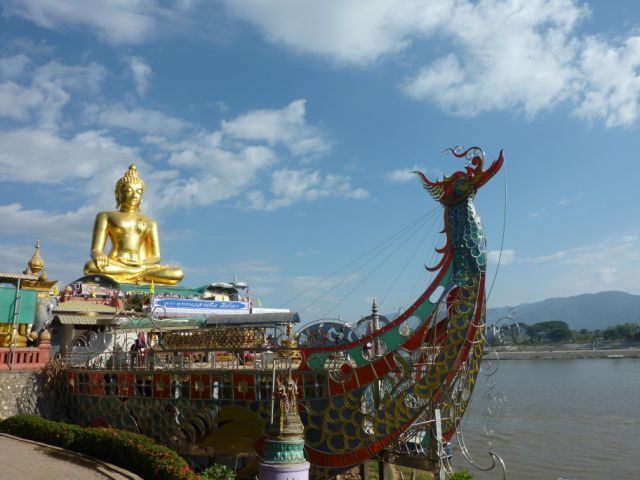 チェンセーンの少し手前にゴールデントライアングルがあります。 ソウテウを数分停めて写真だけ撮ろうと思えば出来たのかも知れませんが、とりあえず降りてインフォメーションブースでバックパックを見ていてもらい駆け足でその辺りを見て周りました。 そして、次のソウテウがいつくるか分からなかったので、チェンコーン行きを逃したくないと、バイクタクシーでチェンセーンに向かいました。 大きいバックパックは運転手の足元に、自分は小さいバックパックを背負って乗ります。 地元の人は慣れていてどこも掴まずゆとりを持って乗りますが、必死にバイクの後ろを掴み疲れましたが眺めは最高! ソウテウの倍の料金はしますが価値があります。