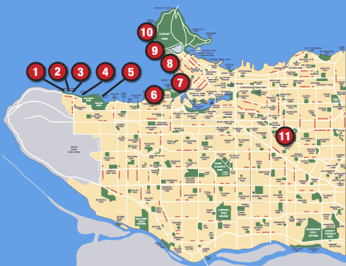 観光客やダウンタウンに住む人、それ以外も公共の交通手段で行きやすく色々楽しめるのでダウンタウン側の7~10のビーチが人気。 その次に6番のキツラノ、5番のジェリコ (ユースホステルがあります)に多くの人が集まります。 キツラノと9番のセカンドビーチには屋外の海沿い温水プールがあります。 サイクリングやローラーブレードをするにはダウンタウン側、(8・9・10番のビーチ辺り)スタンレーパークの周りが整っていてお勧めです。 カイヤックのレンタルはダウンタウン側、イングリッシュベイ辺りで、またジェリコではセーリングやウインドサーフィンのクラスが取れます。