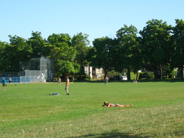 住宅街の公園で野球を楽しむ人達の隣で日光浴。