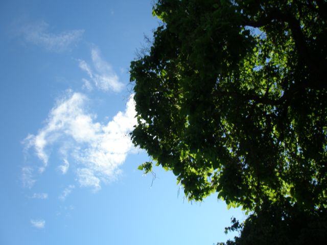 見上げると首が痛くなるくらい高い木。 太陽に透ける緑と青空のコントラスが美しい