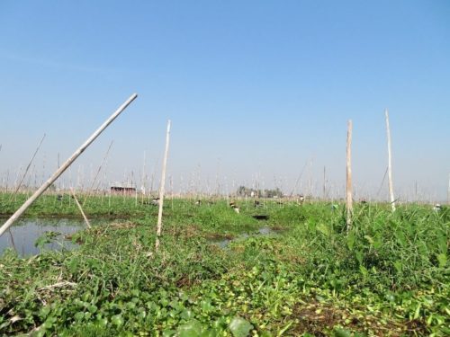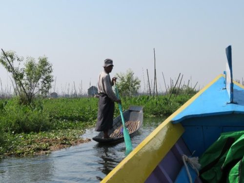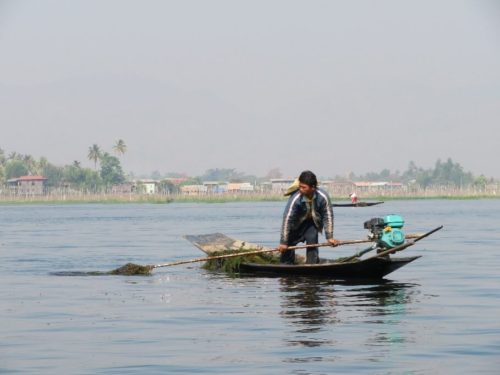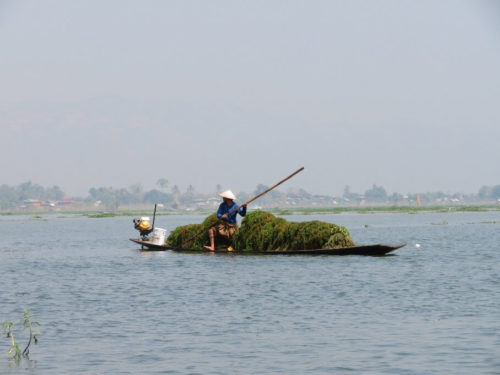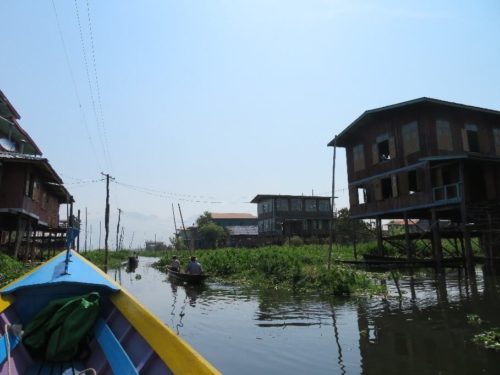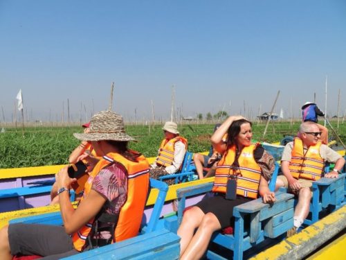 朝食後、バスに乗りインレー湖観光の船乗り場に行きツアー開始。天気のとても良い日で青空と湖が一体化した綺麗な光景。出発前にホテルでツアーリーダーが昔の魚の採り方をデモンストレーションをしてくれました。有名な光景のです。ただ、それは偽物との事。今の漁師達はもっと大きなネットを開発してそれを利用してるそうです。魚や海藻を取る漁師さん達の様子を見て、水上村へ。村近くには水上トマト畑で働く人達が見えたり、とても印象的で皆感動しました。