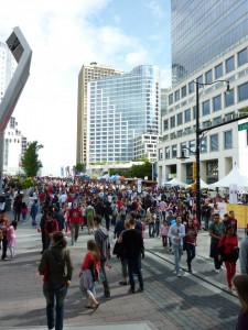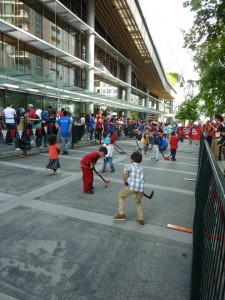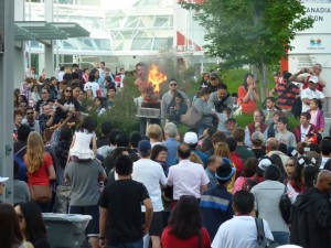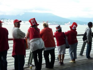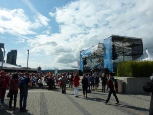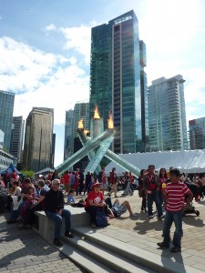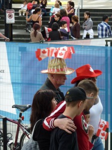どの人種の人達も赤の服や何か赤の物や国旗を身につけて街にくりだします。 昨年はグランビルアイランドとオリンピックビレッジに行きましたが今年はカナダプレイス周辺とダウンタウン中心のロブソンスクエアーと美術館に行ってみました。