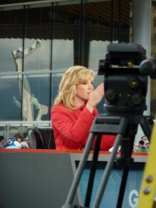 聖火台の手前から地元ニュースが報道(彼女テレビで見ると可愛い感じですが、実物は美人系)